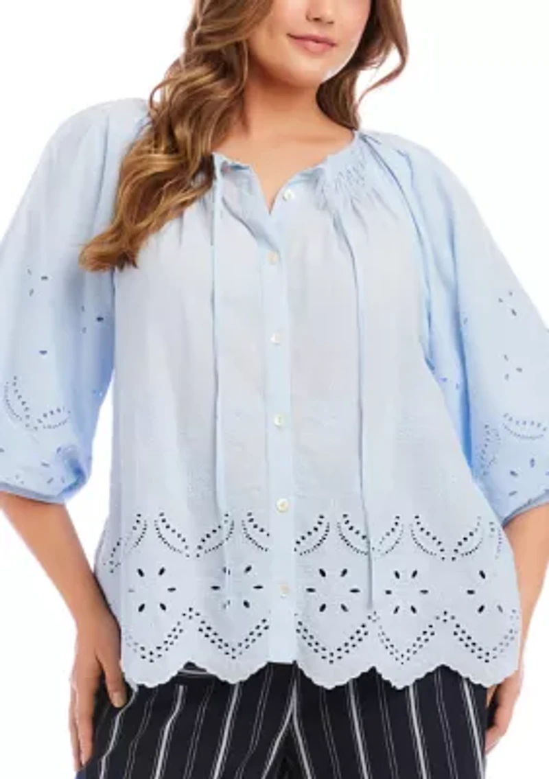 Karen Kane's feminine top is crafted from cotton embroidered woven fabric. Designed with soft puff sleeves, delicate embroidery throughout, a tie-neck detail and a button-front closure for easy, everyday wear. Dry clean only 100% cotton Imported Button closure Tie neck Short puff sleeves Product Specifications 28" L