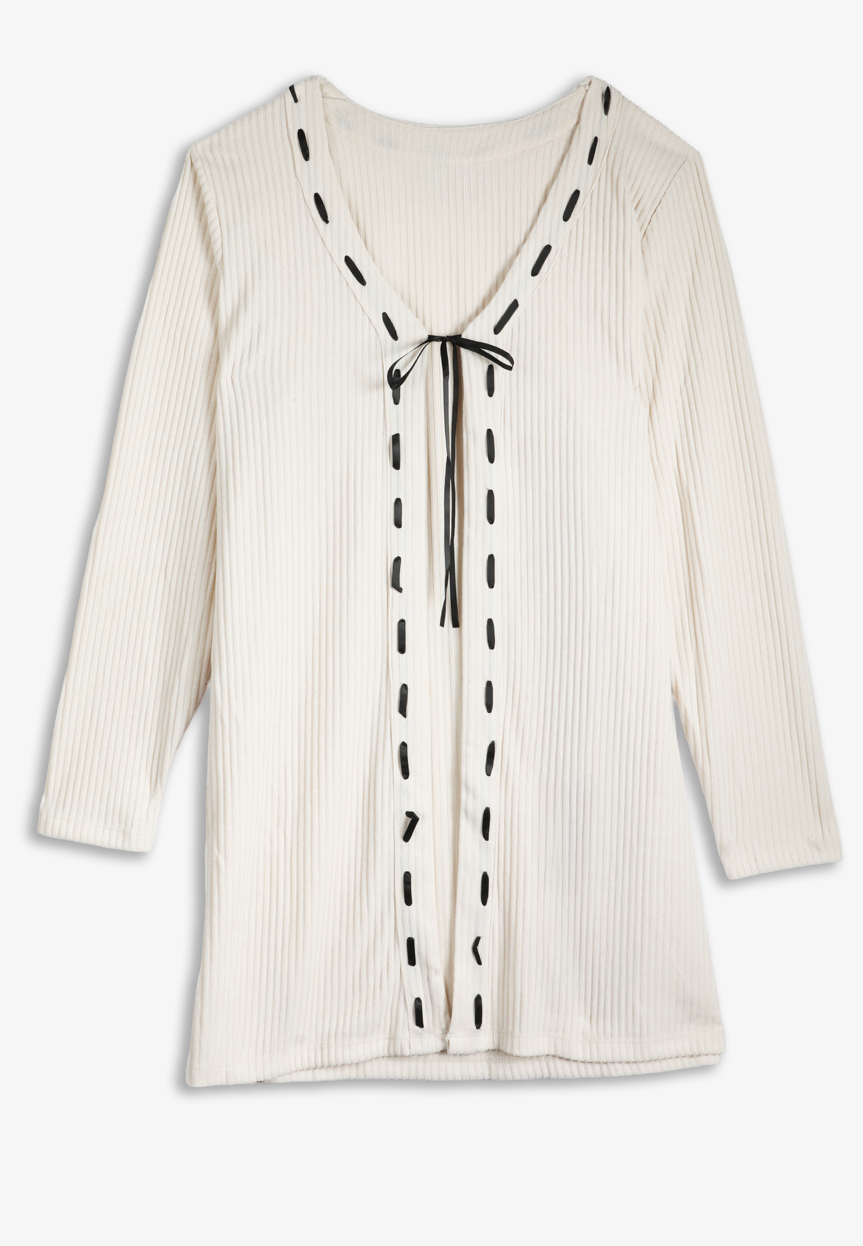 - Ribbon front tie whipstitch like trim along the front edges and neckline