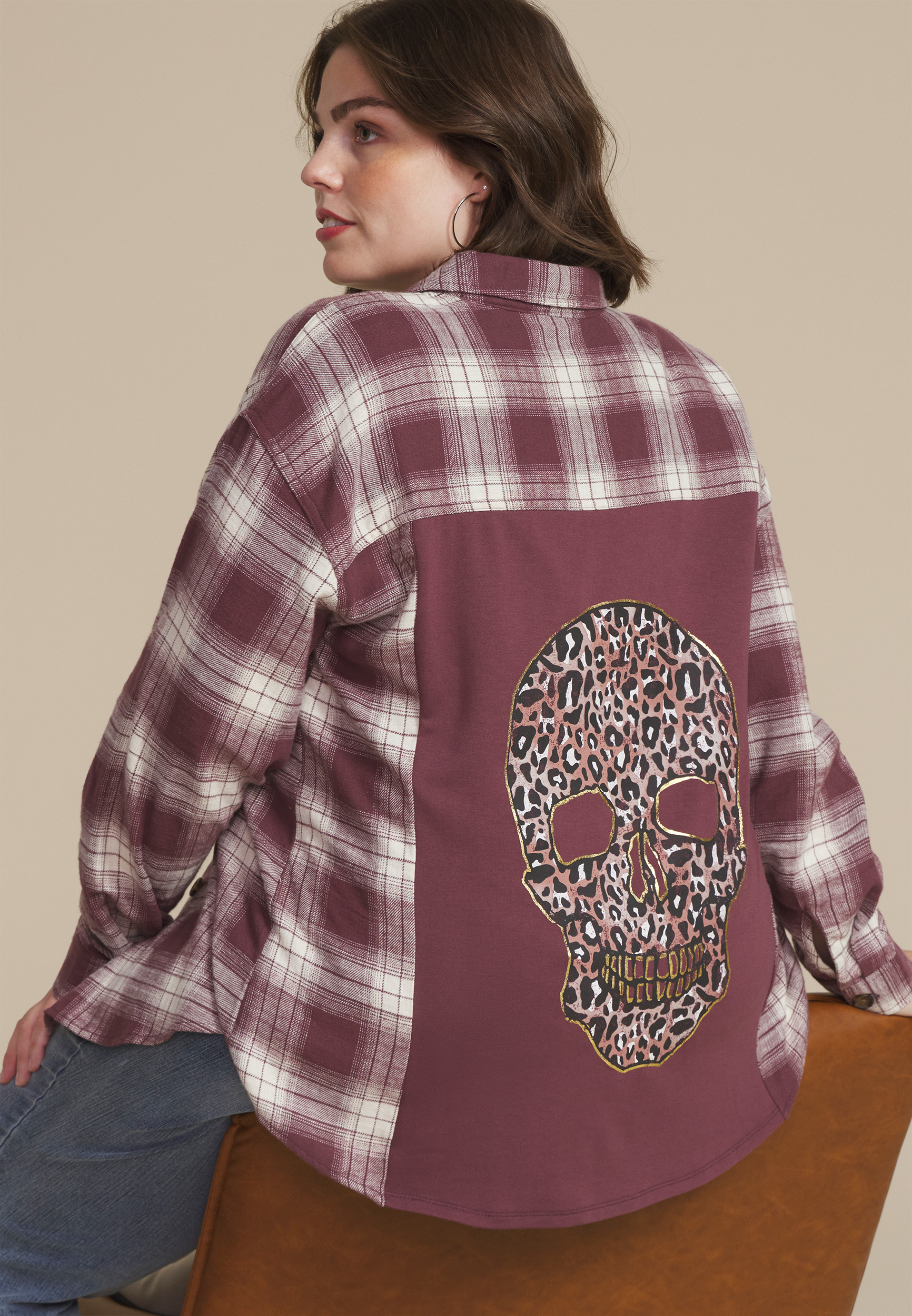 Plus Size Cabin Plaid Graphic Back Leopard Skull Button Down Shirt in Chattanooga, TN