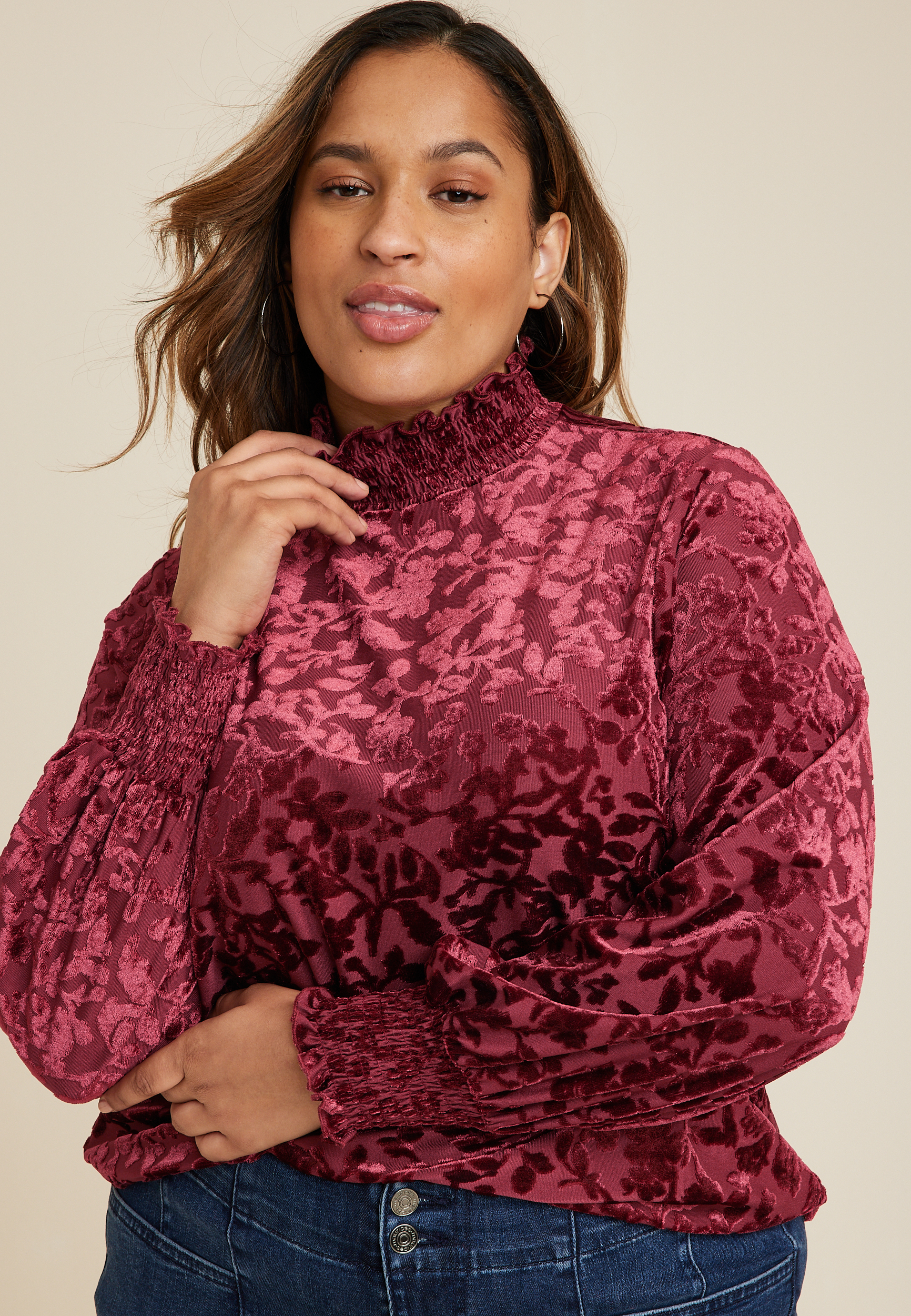 Plus Size Velvet Floral Burnout Mock Neck Top in Chattanooga, TN