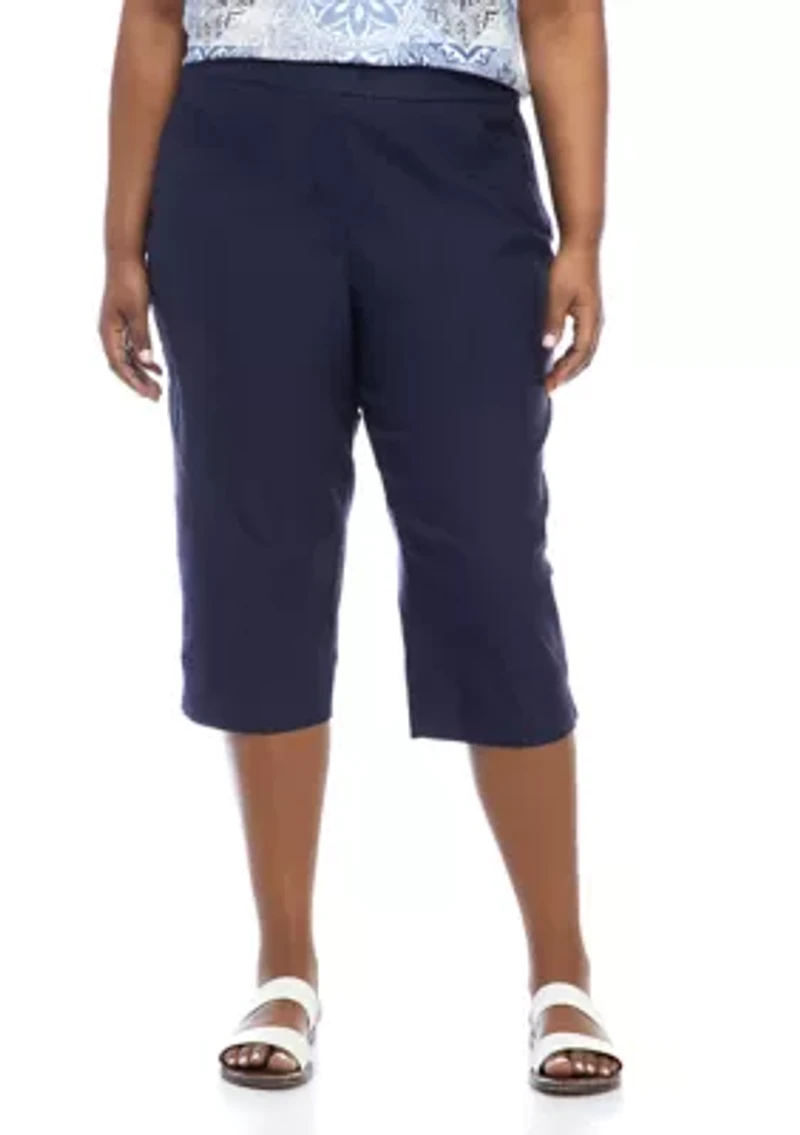 Featuring a cropped fit, these solid capris by Alfred Dunner display pocket details, side slits, and an elastic waistband for added comfort. Elastic waistband 2 on-seam pockets Imported Product Specifications 19 in Inseam Material & Care Rayon, nylon, spandex Machine washable
