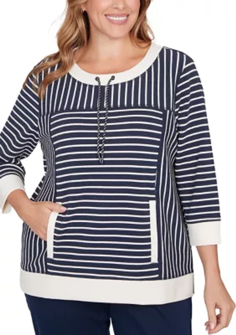 This textured popover from Ruby Rd blends casual comfort with polished detail. Designed in yarn-dyed ottoman stripes with contrast trim, it features a drawstring neckline, 3/4 sleeves, and front patch pockets for an easygoing, modern look. Pullover Scoop neck Unlined Imported Product Specifications 27.5" L Material & Care Polyester, rayon, spandex Machine washable