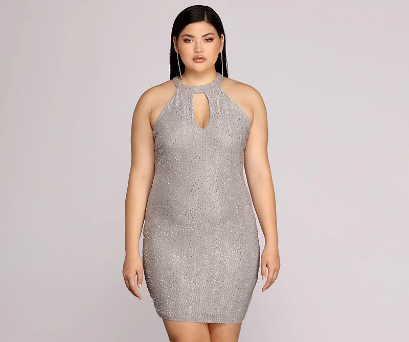 You are a stunner doll! And this is the dress to prove it. Featuring a high halter style neckline, a sleeveless bodice, and a keyhole cut out at the breast. This mini dress is fully lined with a smooth inner material. Dress has a long zipper from lower back to neck, and is composed of a knit fabric that offers a form fitting silhouette with maximum stretch. The pattern of the fabric is adorned with a vertical stitching and all over gemstones. The hem of the dress hits mid thigh.  Model is 5'11 with a 42" bust, 35" waist and 49" hips. She is wearing a size 1X.Special Occasion products cannot be returned to any retail locations.