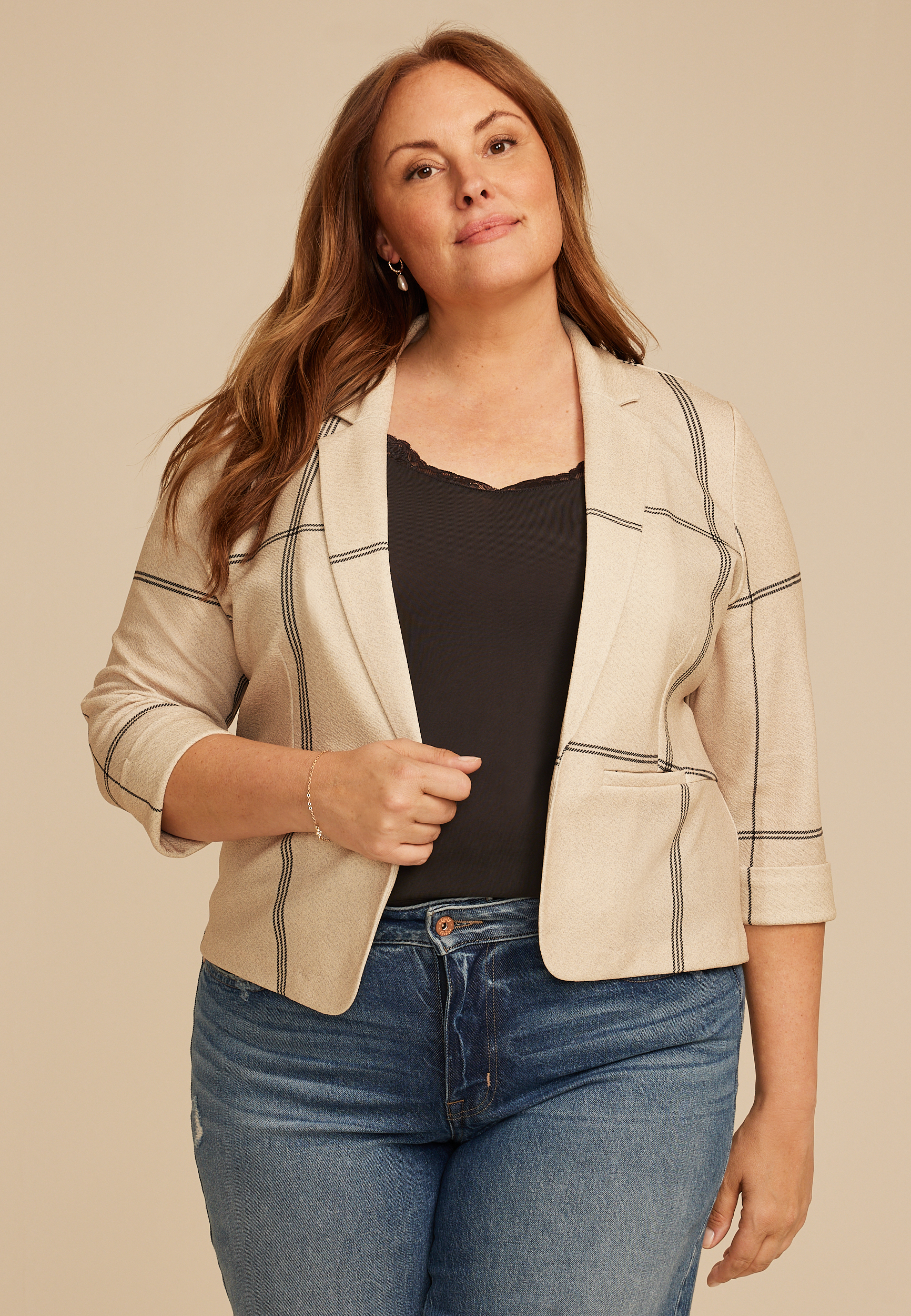 Plus Windowpane Plaid Versa Open Front Cropped Blazer in Chattanooga, TN