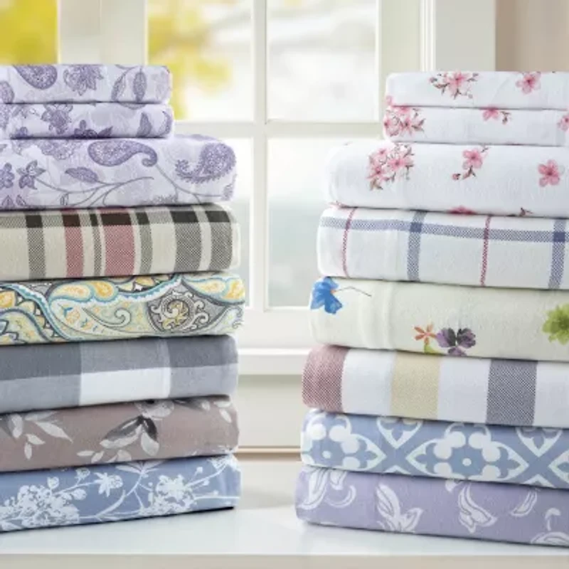 Enjoy the soft, cozy feel of these printed heavy-weight brushed cotton flannel sheet sets. Many fashion designs to choose from to enhance your bedroom decor. The fitted sheet has elastic all around entire sheet to ensure a good fit, also has an 18" drop to fit most deep pocket mattresses. Environmental friendly with the Oeko-tex certification. To complete your ensemble also available on line are coordinating duvet set, extra pillowcases, and for select styles quilt sets. The cotton flannel set includes a flat sheet, a fully elasticized fitted sheet, and two pillowcases with Euro flap closures. Choose from 12 unique prints to complement your existing bedding