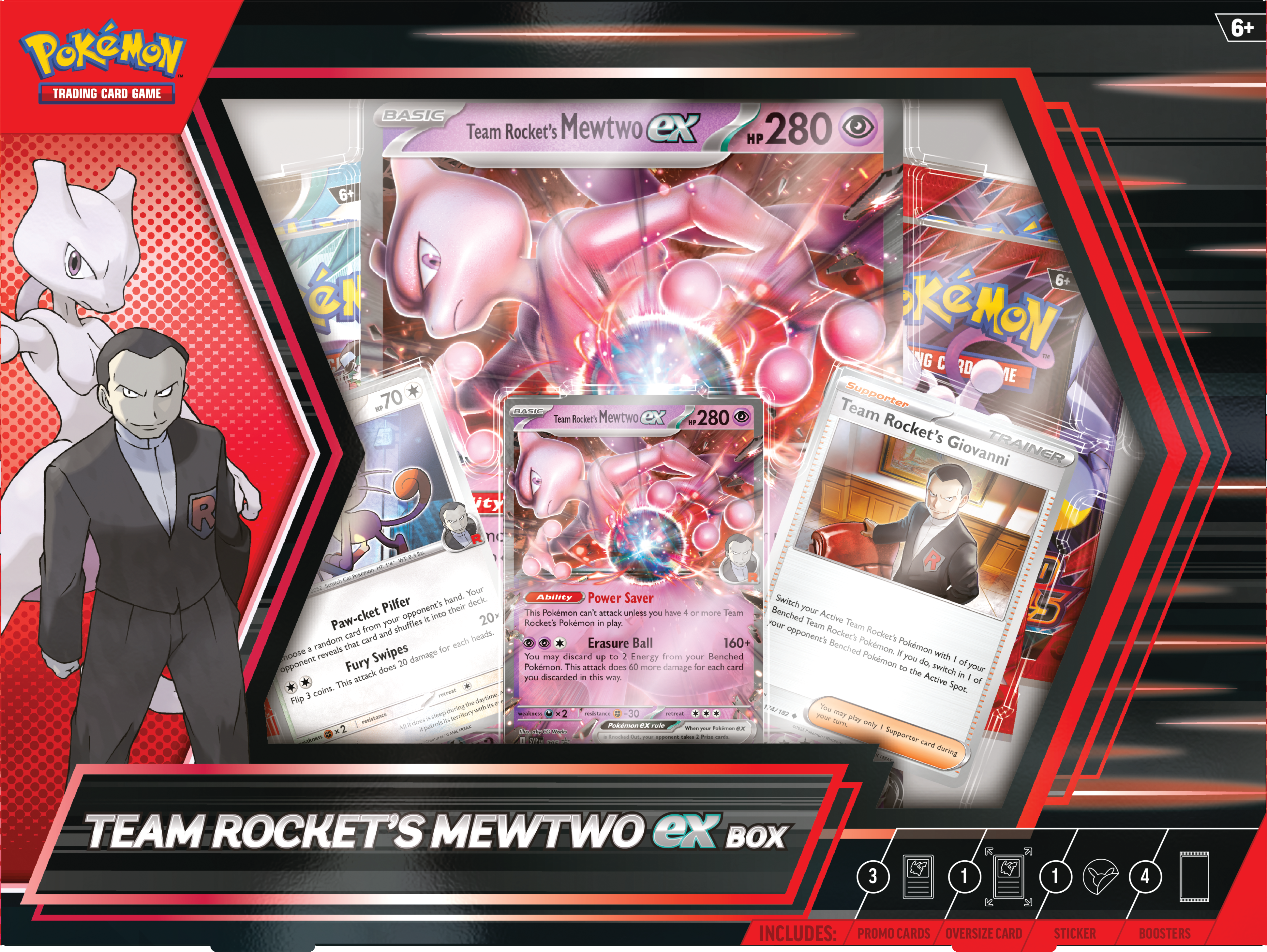 When Team Rocket’s Mewtwo ex has backup from other Team Rocket’s Pokémon, its Erasure Ball attack can do up to 280 damage in one massive blow. In this box, you’ll find this powerful Pokémon ex as a foil promo card, along with Team Rocket’s Meowth and Team Rocket’s Giovanni, plus a photo sticker and handful of booster packs.