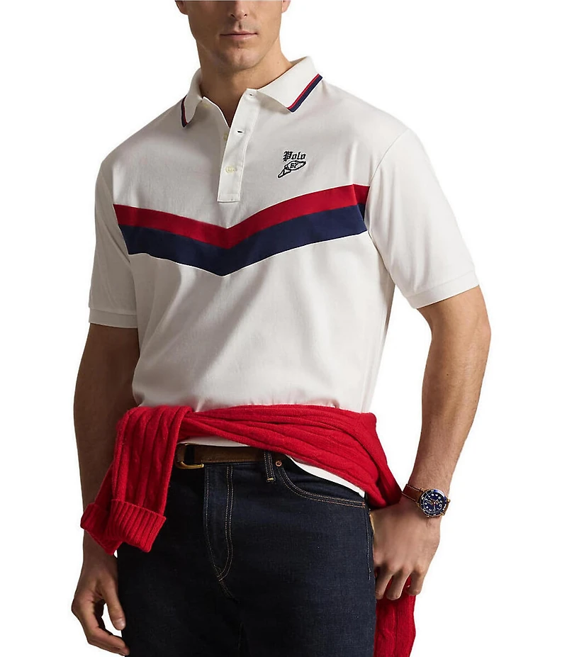 From Polo Ralph Lauren Big & Tall, this polo shirt features: Winged foot graphic with gothic “Polo” logo and “67” embroidered at the left chest Ribbed polo collar with striped tipping Short sleeves with ribbed armbands 3-button placket Even vented hem Cotton interlock Machine wash/tumble dry Imported.