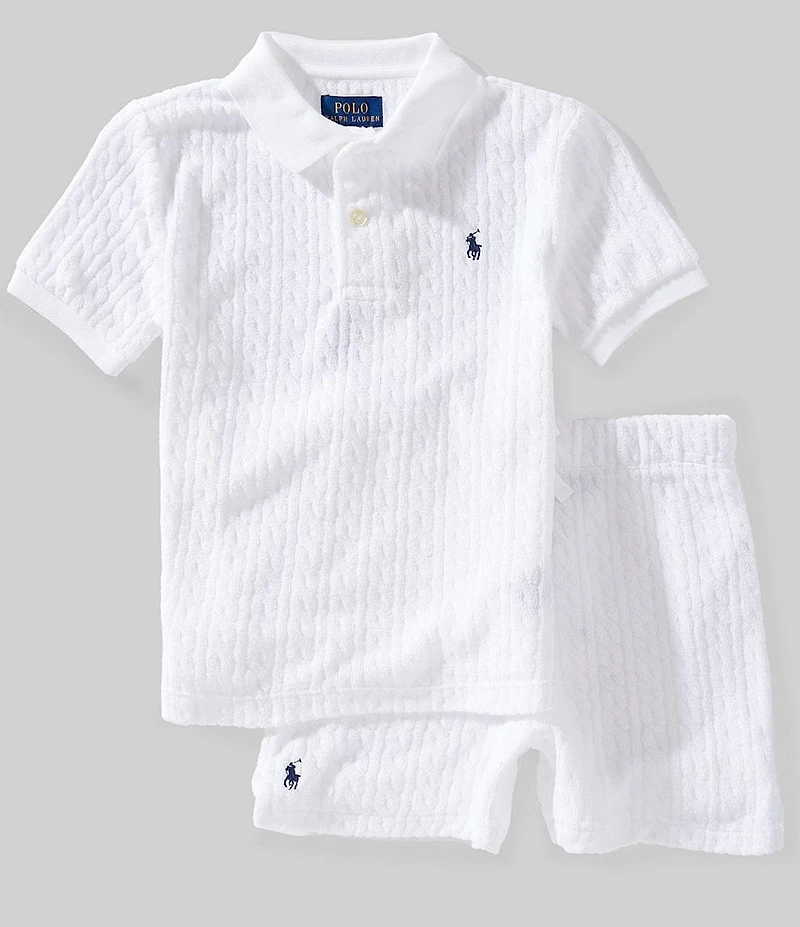 From Polo Ralph Lauren, this two-piece set features: Top: Solid cable terrycloth polo shirt Ribbed polo collar Short sleeves Ribbed armbands Two-button placket Signature embroidered pony at the left chest Even vented hem Shorts: Matching cable terrycloth shorts Pull-on styling Drawstring/elastic waistband Signature embroidered pony at the right hem Vented hems Care: Cotton/polyester cable terrycloth Machine wash/tumble dry Imported.