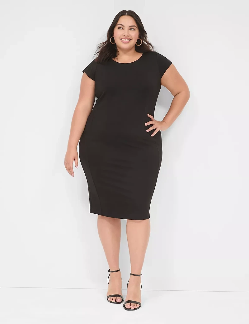 Available in Plus Size Command every room with confidence in this silhouette-loving dress, designed in smoothing ponte. The crew neck and cap sleeves are classic, chic details sure to wow. Crew neck. Cap sleeves. Princess seams. Center back vent. Hidden back zipper with hook & eye closure.FABRIC: Ponte. Smoothing knit that's stretchy but structured.Looking for a smoothing secret weapon to wear with this dress? Try our Cacique Smoothing collection. From our Totally Smooth and Invisible Backsmoother bras, to our best-in-class Shapewear & panties, we offer a variety of solutions for 360 degrees of smoothing support and all-day comfort. Item Number #405646Front Length (On Body): 44" Imported Plus Size Dress ". Plus Size Ponte Cap-Sleeve Crew-Neck Dress, in Ascena Black, 14, Women's, Lane Bryant
