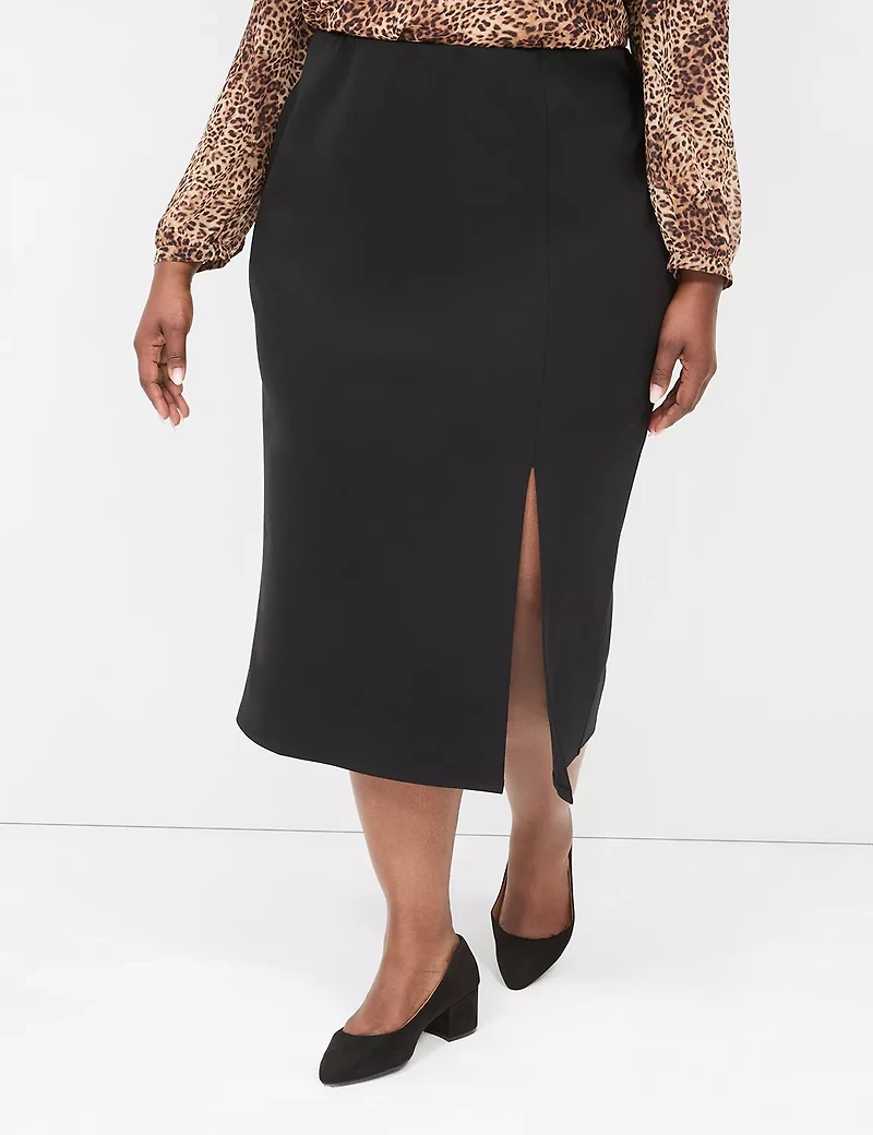 Available in Plus Size Ponte play is this so-soft knit skirt, with a sexy slit at the front. Style with everything from graphic tees to polished blouses. Elastic waist. Slit at front. Ponte - smoothing knit that's stretchy but structured. High stretch, medium drape. Item Number #408532Length: 33" Imported Plus Size Skirt ". Plus Size Ponte Front-Slit Column Midi Skirt, in Ascena Black, 16, Women's, Lane Bryant