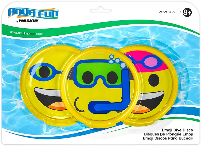 Use the Poolmaster Emoji Dive Discs Set for some underwater diving fun. The discs are weighted, so they sink right to the bottom of the pool. Each emoji design has a unique swimming accessory, like goggles or snorkel gear, to make the game even more fun.