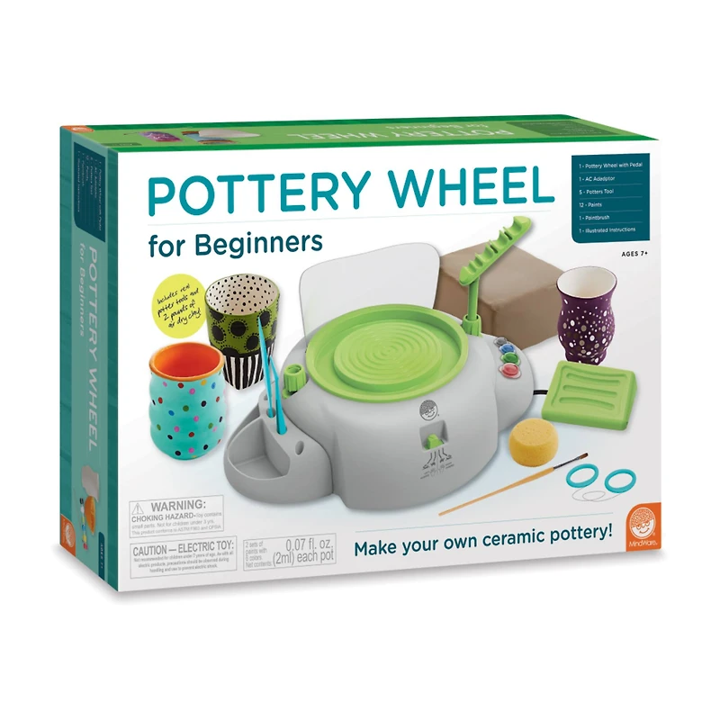 It's easy for anyone to create unique and colorful clay pots, vases and more with this dual-speed motorized pottery wheel. A convenient foot pedal allows for easy on-off action. The dual-direction design lets artists choose a setting for right or left handed pottery throwing. Detailed instructions include helpful illustrations to guide beginning potters every step of the way - from starting with the right amount of clay to decorating the finished piece. The AC adapter provides real power for a satisfying experience. When you finish with your pottery, you have the professional tools it takes to turn them into your own works of art. A clay cutting tool, modeling tool, engraving tool, brush and full set of paints let you express your creativity and personal style.Contents include: 1 Pottery Wheel with Foot Operated Pedal, 1 AC Adapter, 1 Clay Cutting Tool, 1 Modeling Tool, 1 Engraving Tool, 2.5 lbs of Air-Dry Clay, 12 Paints, 1 Paintbrush, 1 Sponge, Illustrated InstructionsFor 1 playerAges 7 and upMade in ChinaBrand new condition in original packagingWipe clean with dry or damp clothWarning: Choking Hazard - Contains small parts not suitable for children under 3 years.
