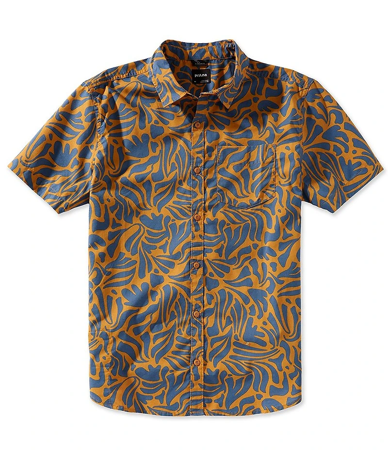From prAna, this shirt features: Allover print Point collar Short sleeves Button-front closure with faux corozo buttons Left chest pocket Prana wordmark label at bottom hem Organic cotton/recycled polyester Machine wash/tumble dry Imported.