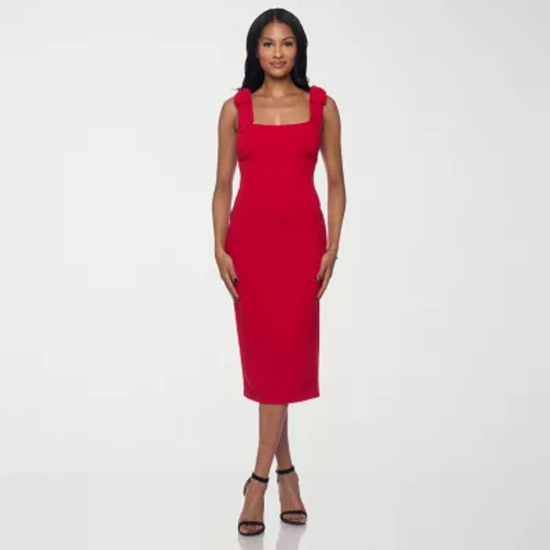 This Premier Amour women's midi sheath dress comes in a vibrant red tone and with bow adorned straps to make an elegant style statement at your next party. Made from stretch-scuba, this sleeveless dress has a flattering fit with a back split. Wear it with pumps.