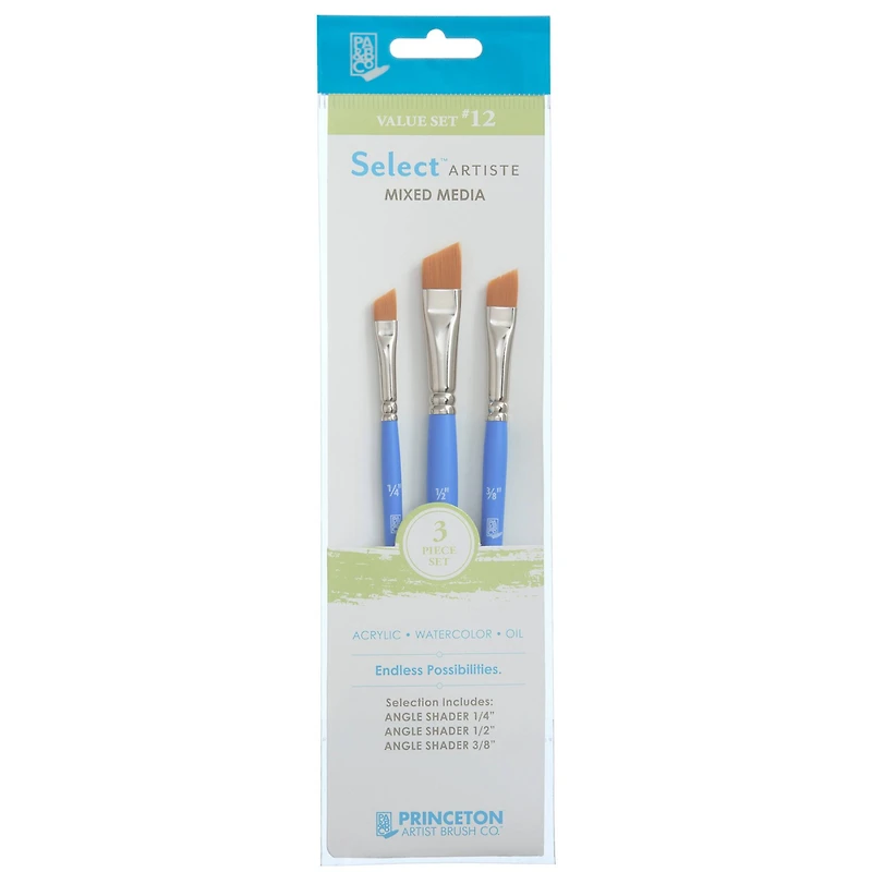 Explore traditional and avant-garde techniques on nearly any surface! Princeton's Select Artiste mixed-media brush sets feature a variety of assortments of brushes that work well together. These quality, short handled brushes are made to last. With their robin's egg blue colored handles, they will be a beautiful addition to your existing brush collection as they go above and beyond basic brush shapes and sizes. Details:Angle shader3 brushesSelect syntheticSturdy silver ferruleRobin's egg blue colored handlesFor use with oil, acrylic and watercolorContents:1/4" angle shader1/2" angle shader3/8" angle shader