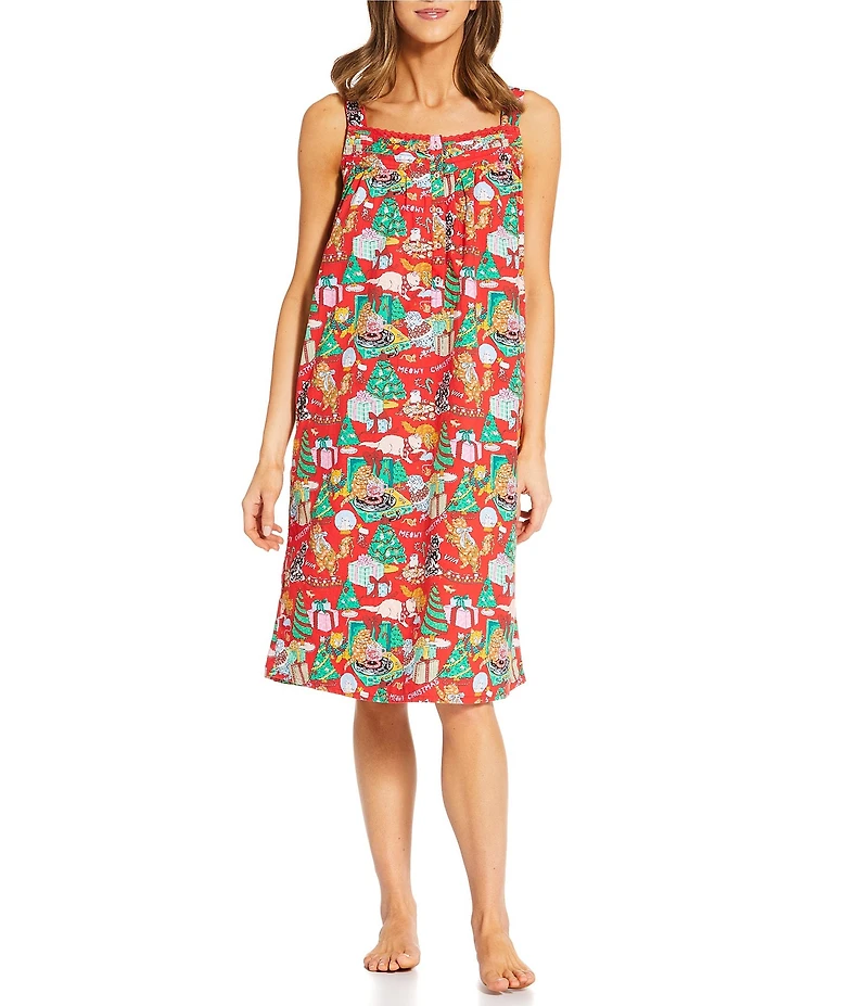 Printfresh Woven Meowy Christmas Sleeveless Sweetheart Neck Partial Button Front Nightgown in Chattanooga, TN