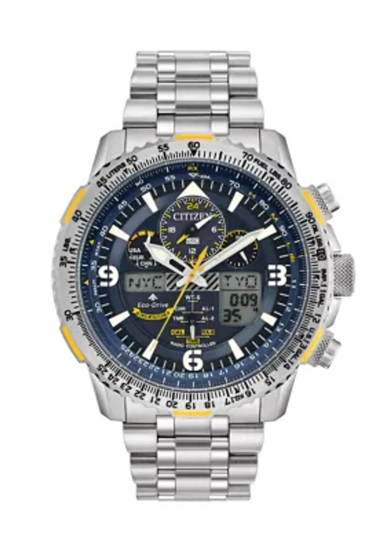 The Blue Angels are the Navy's elite flight demonstration squadron renowned for their precision and grace showcased in each of their flight maneuvers. This precision and grace are exhibited in the CITIZEN Promaster Blue Angels Skyhawk A-T with precise atomic timekeeping in 43 cities. Other features include a chronograph, perpetual calendar, dual time, alarms, countdown timer, digital backlight, and UTC display, power reserve, and pilot's rotating slide rule bezel. This model appears in a Super Titanium™ case and bracelet, yellow accented dark blue dial with the Blue Angel's insignia replicated on the case back. Featuring Citizen's Eco-Drive technology – powered by light, any light. Never needs a battery. Caliber number U680. Foldover clasp Chronograph dial Japanese quartz movement 5-year limited liability warranty Imported Product Specifications 45 mm round case Material & Care Titanium Clean with a soft cloth