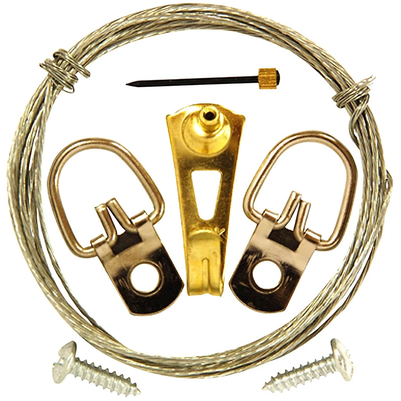 Here is everything you need to hang one picture perfectly! Hardened blue steel nails with brass collars are reusable and leave only a pin-sized hole on wall surface that can be easily painted over. Weight ratings are based on hangers nailed into studs and are not cumulative, so two hangers will not hold double the weight. For best results, choose a recommended weight rating that greatly exceeds the object to be hung. Details: For objects weighing up to 30 lb. Ideal for plaster/drywall surfaces For wooden frames only 7 piece kit Contents: Blue steel pro nail 9 ft. wire coil 2 D-ring hangers with 1-hole 2 screws Pro hanger