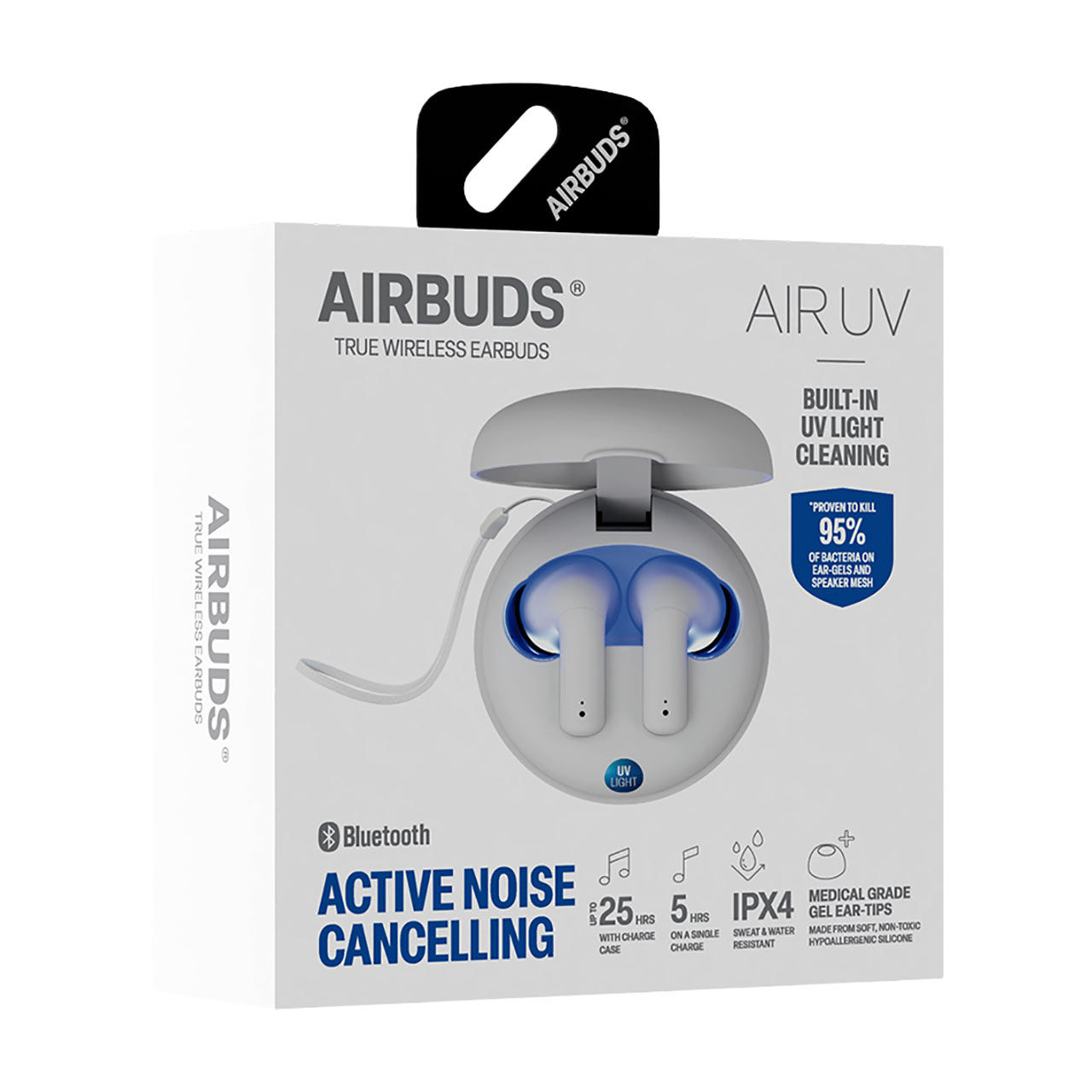 • Built-in UV light sanitizes earbuds between uses