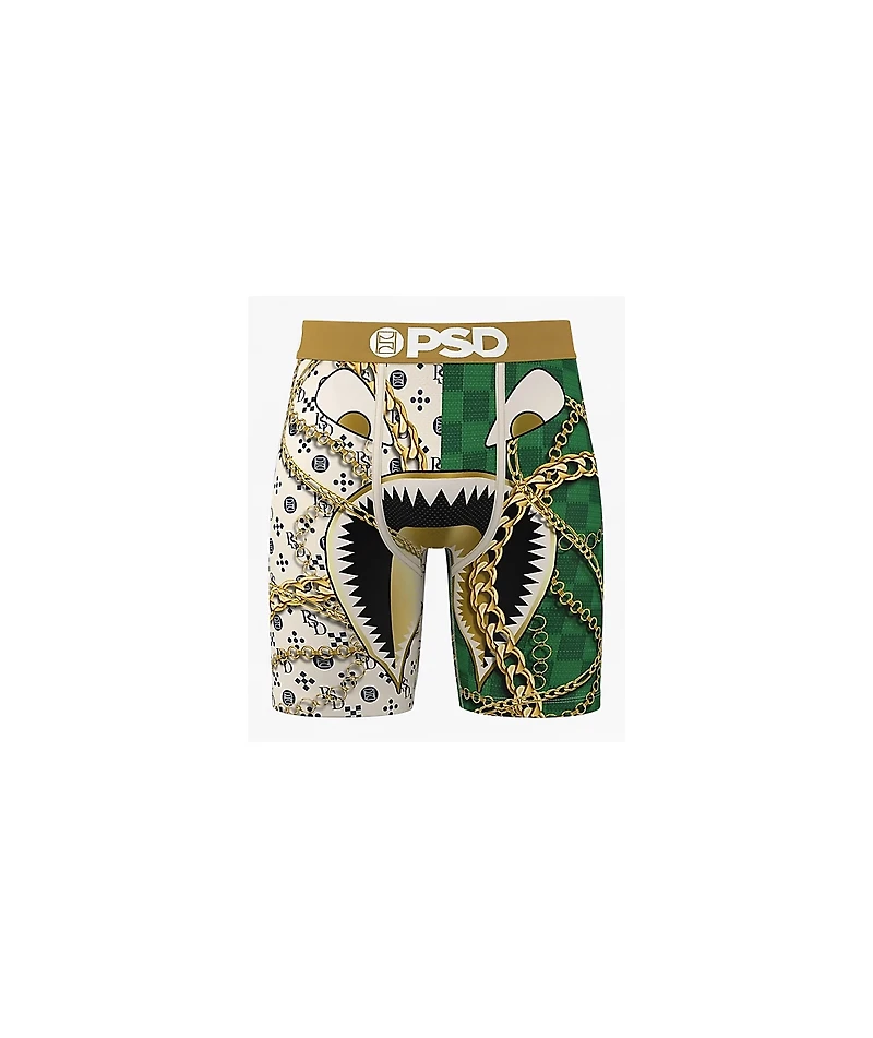 The War Face Prestige Split boxer briefs from PSD deliver a two-sided look that doesn’t blend in. One half leans bold with a jagged war-face illustration wrapped in layered chains, while the other half brings visual noise with allover multicolor PSD