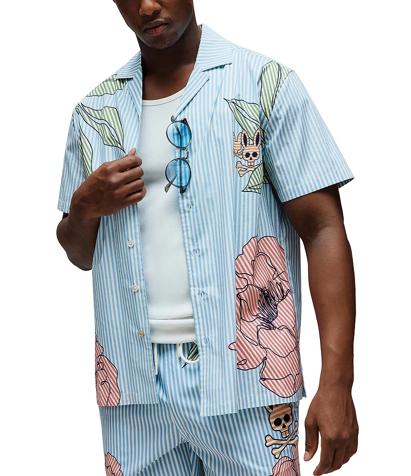 From Psycho Bunny, this shirt features: Allover print Camp collar Short sleeves Button-front closure Straight hem Regular fit Stretch fabric Cotton/elastane Machine wash/line dry Imported.