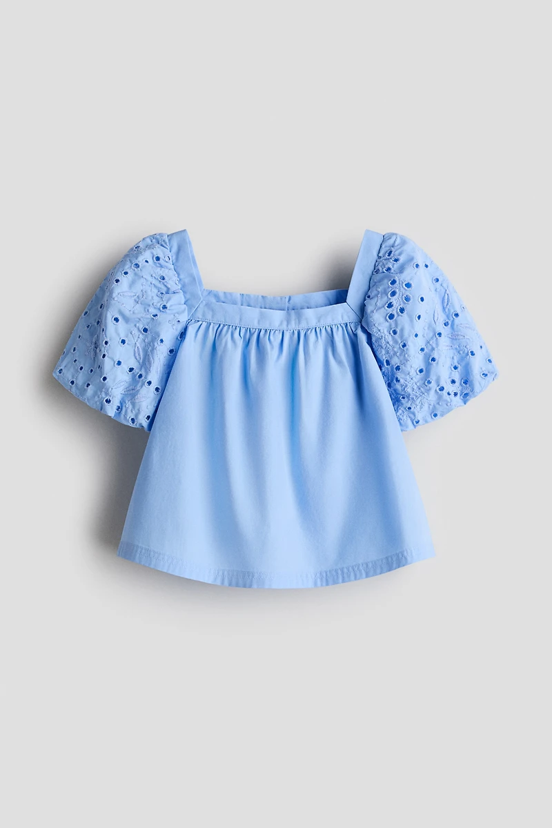Flared blouse in soft cotton poplin with short, lined puff sleeves in broderie anglaise. Square neckline with gathers all around and a concealed press-stud at the back.