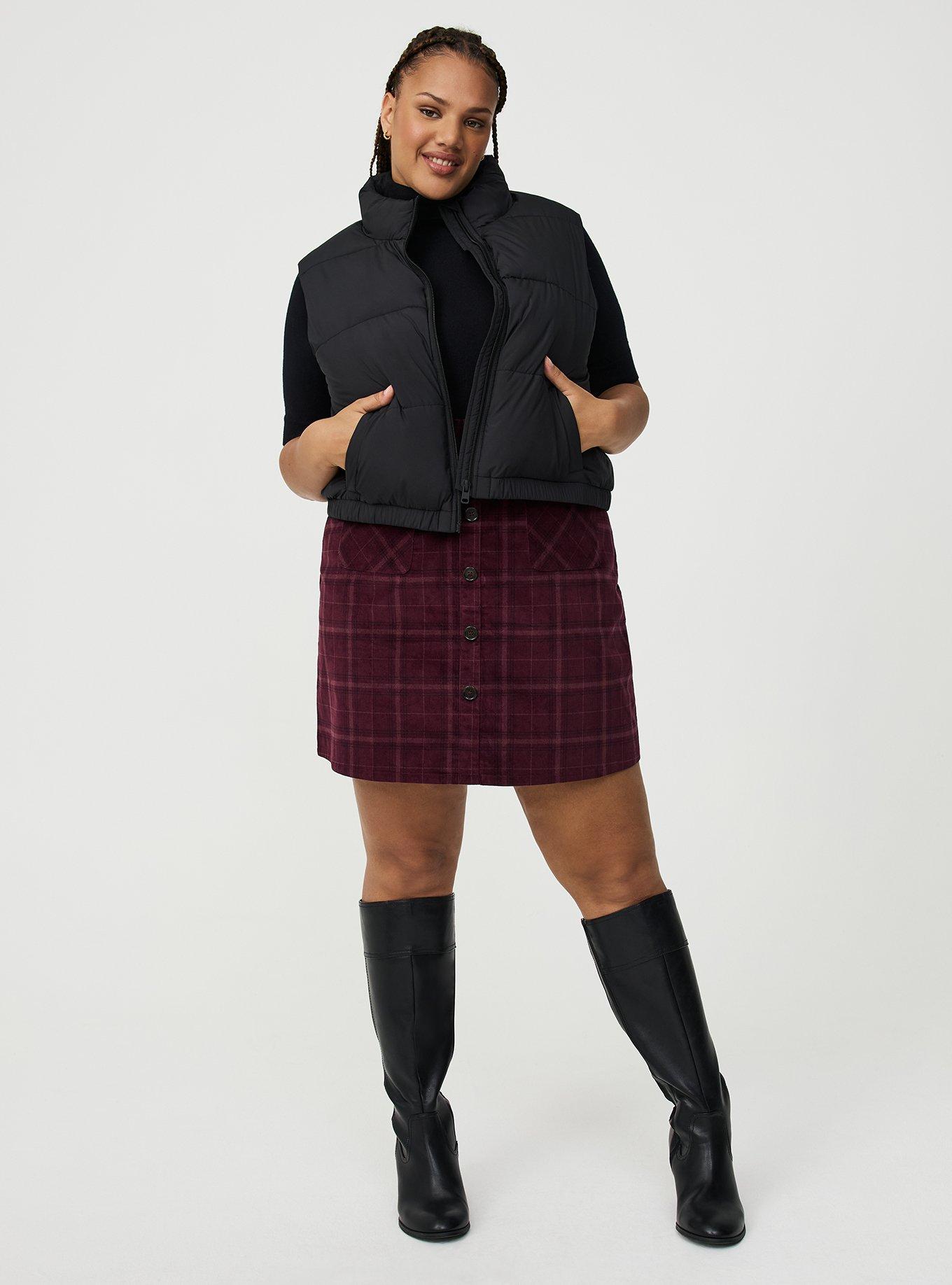 FIT Measures 25'' from shoulder (size 2). MATERIALS + CARE Cold weather polyester woven fabric. 100% polyester. Machine wash cold. Tumble dry low. Imported. DETAILS Mock neckline. Sleeveless. Zip front closure. Hip welt pockets.
