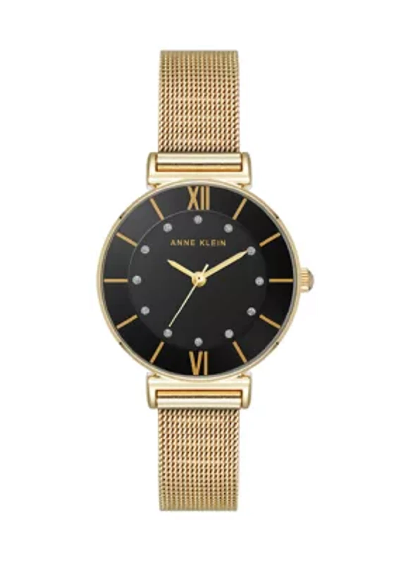 This iconic watch from Anne Klein is a classic favorite. Featuring a stainless steel mesh band, this timepiece wears easily from day to night. Foldover clasp Analog dial Japanese quartz movement Polished finish 11-year limited liability warranty Imported Product Specifications 3.98" x 3.98" x 3" 29 mm case size Material & Care Stainless steel, gold-tone metal Clean with a soft cloth