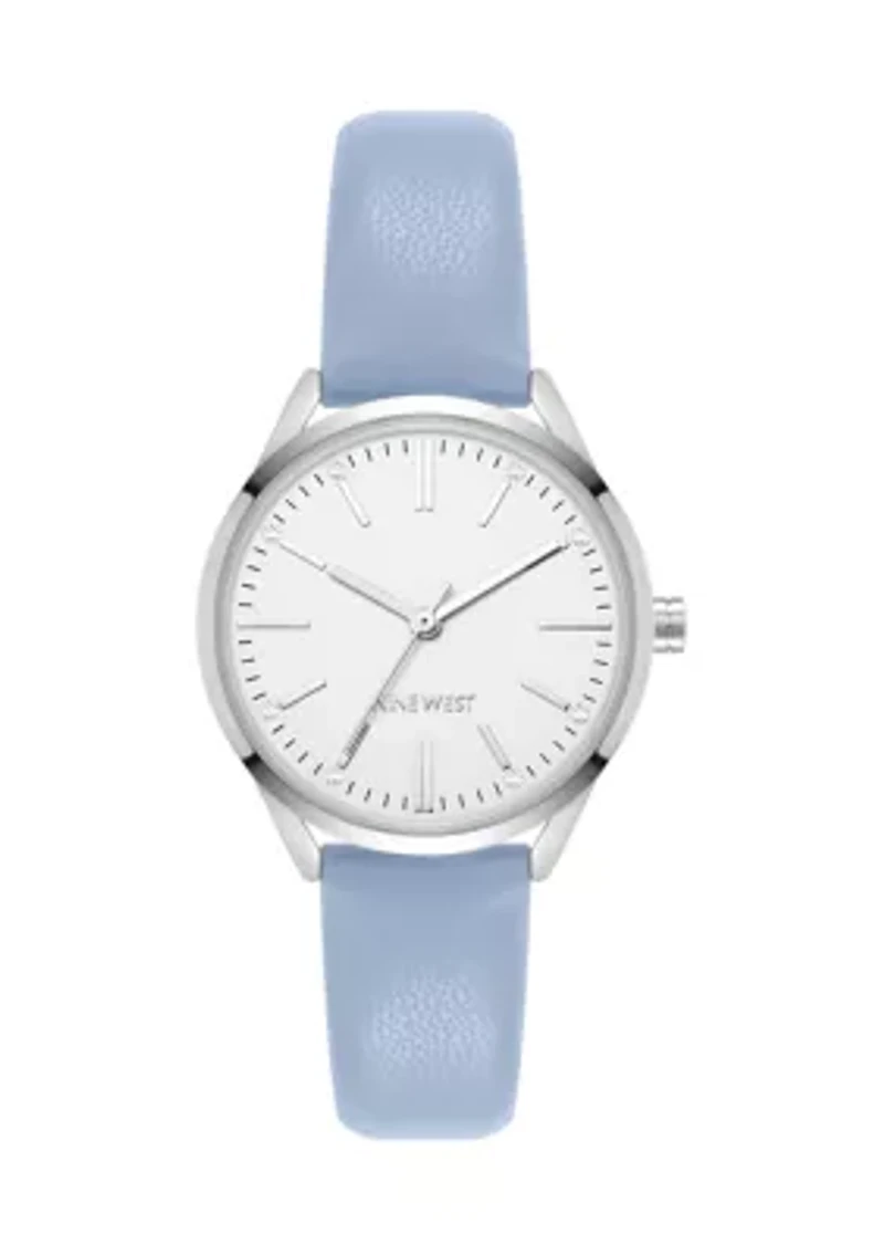 This charming light blue faux leather watch from Nine West is a classic go-to. This watch features a clean, silvery white dial and silver-tone plating. Buckle closure Analog dial Japanese quartz movement Polished finish Limited liability warranty 11 years Imported Product Specifications 101mm x 101mm x 76mm 32mm case size Material & Care Silver-tone metal, polyurethane Clean with a soft cloth