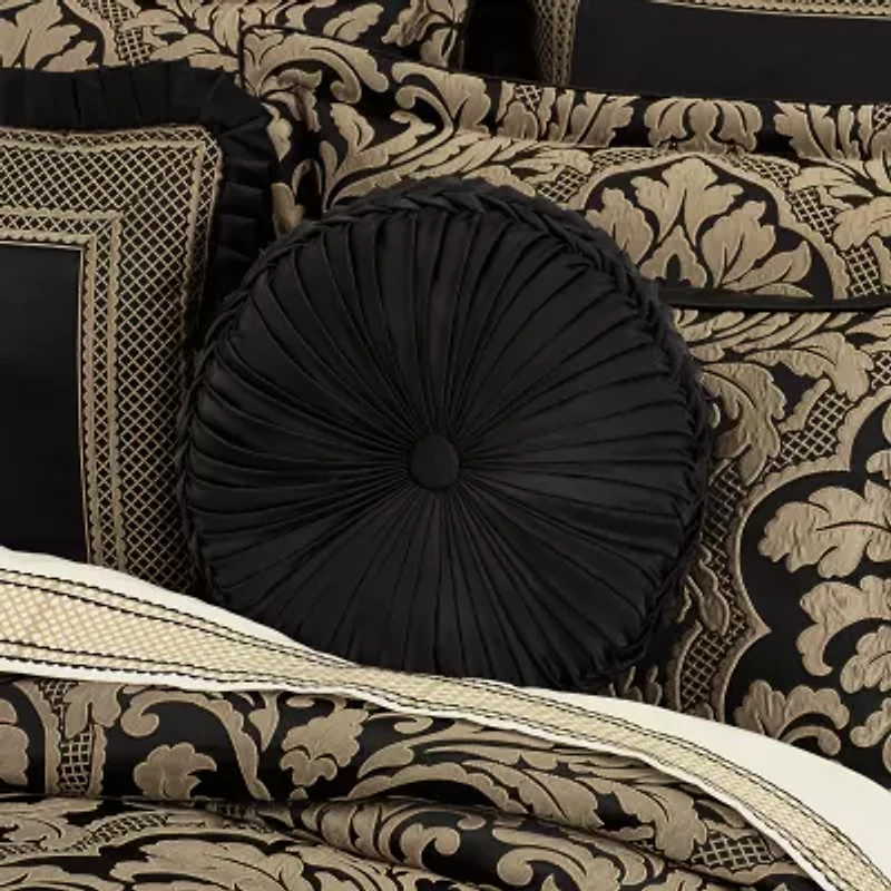 The Branson tufted round pillow uses a beautiful black woven fabric to create a one-of-a-kind accent to this bedding ensemble. This 15" unique pillow is sewn by hand and is finished with a fabric covered button on both sides. Pair this signature accent piece with the Branson bedding set by queen street for a complete elegant look.
