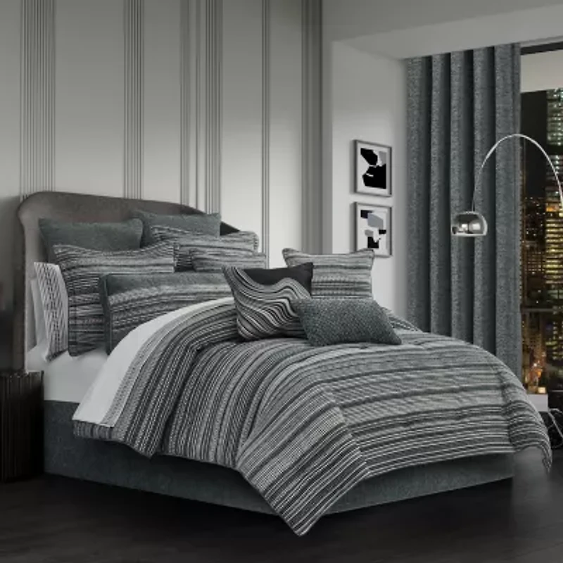 Update your bedroom decor with the Prairie 4 Piece Comforter Set, that is intricately constructed with a stunning woven chenille fabric. Featuring a horizontal chenille stripe accented with diamond motifs in a stunning slate color with hints of black, blue, silver and grey hues. The comforter is piped all around and it is paired with matching shams and a tailored bed skirt that pulls the beauty all together. Style this Modern Southwest bedding collection with the Prairie throw pillows, shams, and window treatments for a complete look.
