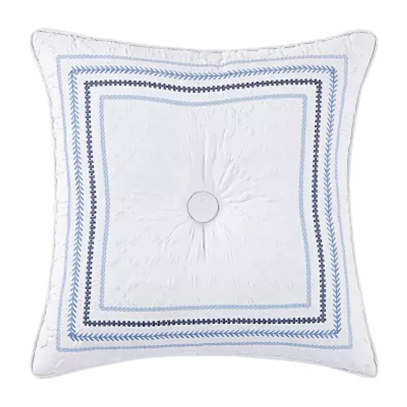 The Blue Haven 18 Inch Decorative Throw Pillow is embroidered with an ocean blue border design with an embossed white fabric offering a contemporary nautical look. The tufted button accent showcases the textured fabric beautifully. Pair this pillow with the Blue Haven bedding set by Queen Street for a complete look.