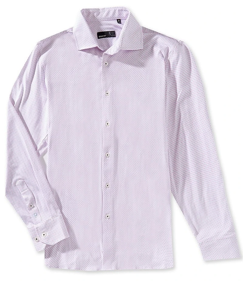 From Quieti, this shirt features: Geo print Modern fit Cutaway collar with hidden collar stays Button-front closure Long sleeves One button cuff Signature "Q" embroidery on the sleeve placket French front Curved hem Soft finish, stretch knit Cotton/spandex Machine wash/dry flat Imported.