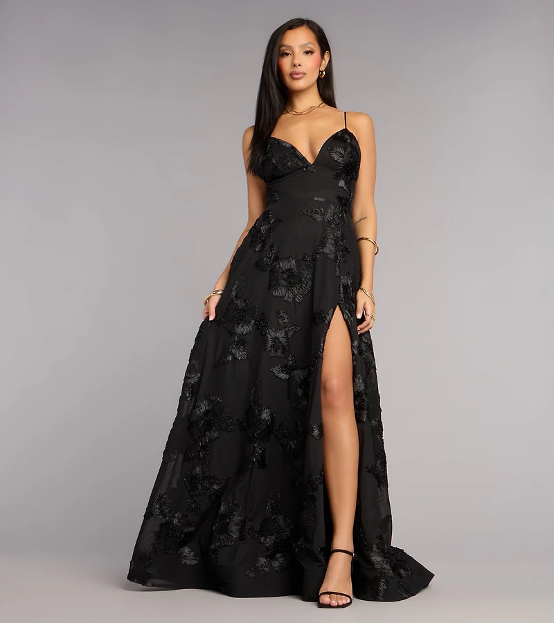 Special Occasion  Striking a balance between romance and refinement, The Quinn dress is designed for moments that call for quiet drama and confident presence. Delicate soutache detailing elevates the flowing A-line silhouette, while the high front slit and bonded floor-length hem create a finish that feels polished and intentional. Fit & Features Mesh satin-lined fabric with dimensional soutache detailing V-neckline with adjustable spaghetti straps, padded bra cups Hidden back zipper and hook-eye closure A line silhouette High front slit Bonded floor length hem Runs true to size   Where to Wear: Prom, black tie galas, weddings, engagement parties, milestone celebrations, big birthday events, elegant cocktail receptions, red-carpet occasions, formal balls