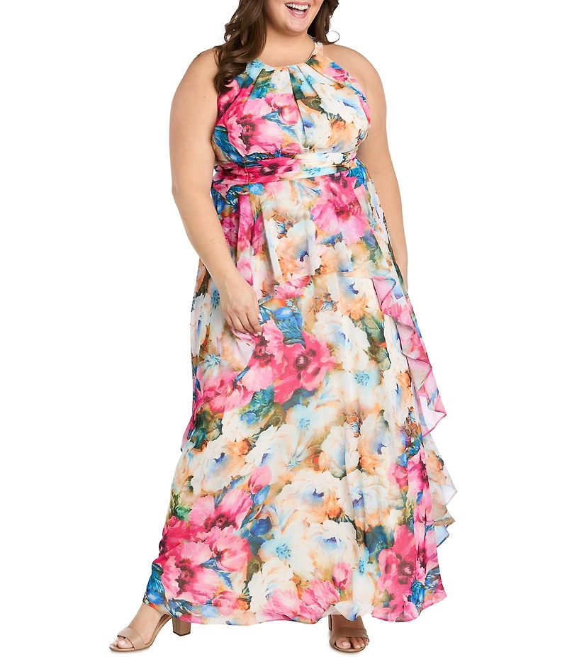 From R & M Richards Plus, this dress features: Chiffon fabrication Keyhole halter neckline Sleeveless Lined Water color floral print Inverted high low ruffle skirt Back zipper closure Approx. 61" in length Polyester Hand wash Imported