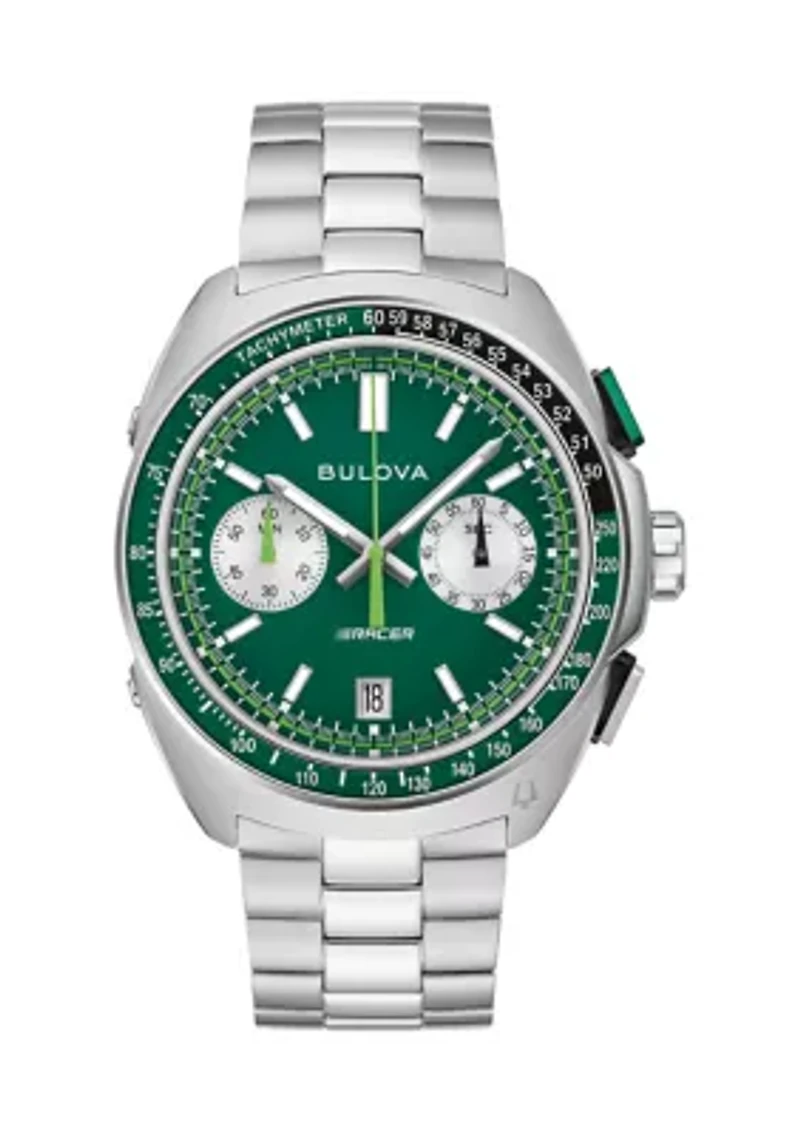Built on Bulova’s vibrant history in motorsport – from soap box derbies to the upper echelons of auto racing – the men’s 5-hand chronograph Racer watch is fine-tuned and designed for performance. Stainless steel is contoured to create a case featuring a unique design that evokes the aerodynamic curves of the world’s fastest automobiles. A two-tone green and black tachymeter ring offers further functionality, while pronounced pushers provide a distinctively automotive aesthetic. Emphasizing the watch’s motorsport roots, the green dial features a racing pattern chapter ring, with a date display at 6 o’clock and silver subdials displaying the chronograph minutes and the running seconds indicator. A vibrant green chronograph seconds hand ensures optimal legibility, no matter the speed. The dial is appointed with applied silver-tone markers and matching beveled hands, all filled with bright luminescent material for low-light visibility. The watch is paired with a 3-link stainless-steel bracelet with a deployant clasp for a secure fit. Whether gripping the wheel around the bend at the track or on your daily commute, the Bulova men’s Racer chronograph is a stylish expression of racing history and a passion for speed. Butterfly clasp Chronograph dial Japanese quartz movement Polished finish 3-year limited liability warranty Imported Product Specifications 48 mm x 42 mm Material & Care Silver-tone metal Clean with a soft cloth