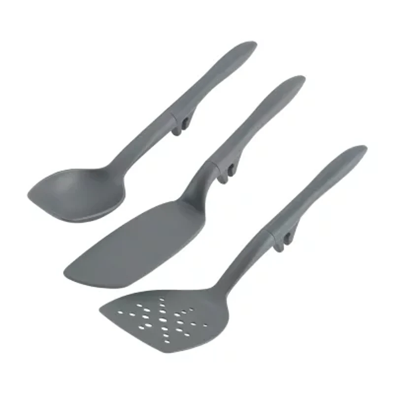 Flip, stir, scramble, or serve when cooking with the rachael ray tools and gadgets 3-piece lazy tool set. The clever notch on these durable kitchen utensils allow them to perch on pot and pan rims so drips and sauces land inside cookware instead of on counters or stovetops. Turners and spoon are durable enough to take the heat, yet gentle enough for use on all cookware, including nonstick.