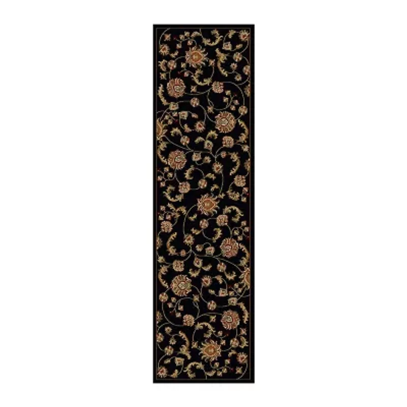 This timeless floral scroll design is a transitional pattern filled with large floral motifs to suit any space. The dominant black base is accented by a gentle floral pattern to complete this transitional design machine made in Italy. Made of heat-set polypropylene, this rug provides a soft, non-shedding, durable, and easy to clean accent to the decor in your entryway, hallway, bedroom, playroom, dining room, or living room. A wide array of sizes and shapes, including rectangles, rounds, and runners, allows this machine made rug collection to fit in any space comfortably.