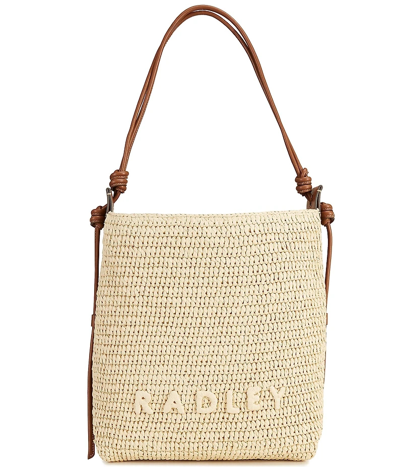 From Radley London , this Camden Raffia Medium Shoulder Bag features: Craft details transform The Camden from an everyday beach-style bucket bag into an artisanal creation. Woven using natural raffia with smooth leather trims, this bags details include a tubular leather strap with sliding adjustability, contrast leather stitching along the edges and a 3D textured version of our signature logo. Natural woven raffia Smooth leather trims Extended side panels with contrast leather stitching Adjustable tubular strap with knotted details Leather-covered magnetic tab fastening with dog clip Interior hanging zipped pocket Embossed logo on leather collar Woven logo Comes with a dust bag Shoulder strap 10" drop Approx. 10" L x 3.6" W x 6.8" H Imported.