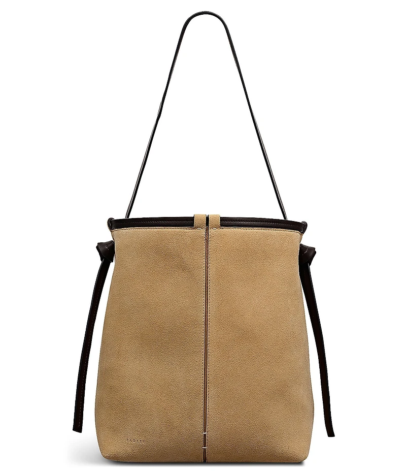 From Radley London, this bag features: An abundance of craft details transform The Connaught from an everyday bucket bag into an artisanal creation. Details include a leather trim threaded through the loops along the top edge, and a flat stitched strap that hangs at the sides with decorative tied knots. Sahara is made with suede and smooth leather Central seam Flat shoulder strap with long knotted ends Threaded leather trim along top edge Leather-covered magnetic tab fastening with dog clip Hanging leather zip pocket Foil detail Detchable strap: 10.0 strap drop, 20.0 strap length. Dimensions: 6 L X 11.2 W X 13.2 H Imported.