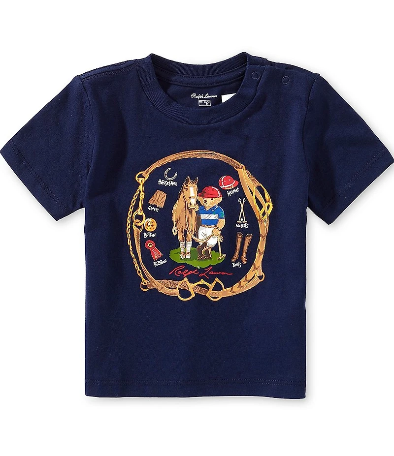 From Ralph Lauren, this t-shirt features: Crew neckline Short sleeves Polo Bear, a horse, equestrian-inspired graphics, and “Ralph Lauren” script printed at the center front Sizes 3–12 months have a two-snap placket at the left shoulder Cotton jersey Machine wash/tumble dry Imported.
