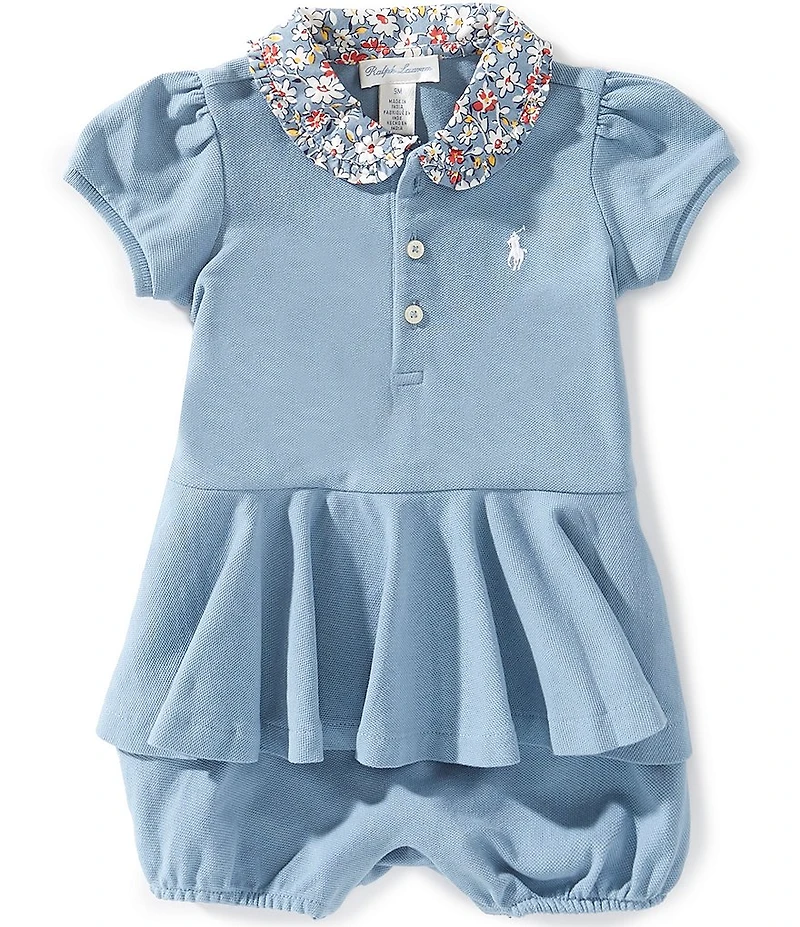 From Ralph Lauren, this romper features: Poplin club collar with ruffle trim Puffed short sleeves with ribbed armbands 3-button placket Buttons custom-developed with a “Ralph Lauren” logo Signature embroidered "Pony" on the left side of chest Flounced peplum hem Elasticized leg openings Concealed ring snaps at the hem Cotton/elastane stretch mesh (exclusive of decoration) Machine wash/tumble dry Imported.