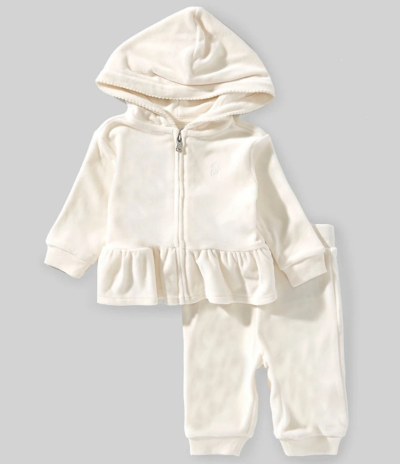From Ralph Lauren, this 2-piece set features: Hoodie: Velour hoodie Jersey-lined hood Picot trim Long sleeves Ribbed cuffs Zip-front closure Signature embroidered pony at the left chest Peplum hem Jogger pants: Matching velour Pull-on styling Ribbed drawstring waistband Pre-tied bow and ribbed leg openings Care: Both of cotton/polyester velour Hood lining of cotton Machine wash/tumble dry Imported.