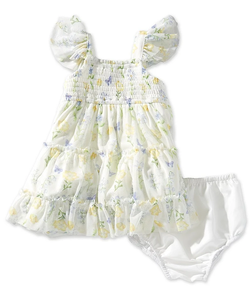 Rare Editions Baby Girls Flutter Sleeve Smocked Floral Printed Mesh Dress