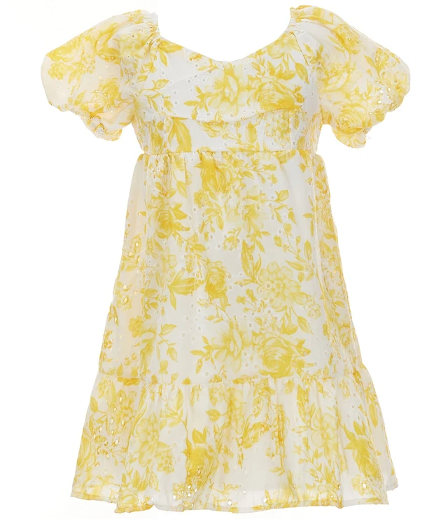 Rare Editions Big Girls Puffed-Sleeve Floral-Embroidered Textured-Gauze Fit-And-Flare Dress