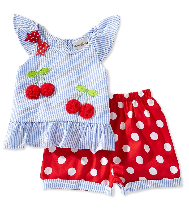 Rare Editions Little Girls Flutter Sleeve Cherry Appliqued Striped Seersucker Top & Polka Dot Shorts Set in Chattanooga, TN