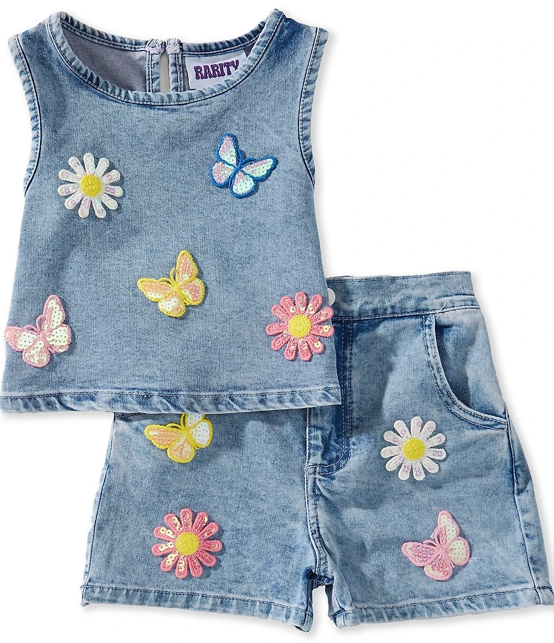 Rare Editions Little Girls Sleeveless Flowers and Butterfly Patch Denim Top & Shorts SetRare Editions Little Girls Sleeveless Flowers and Butterfly Patch Denim Top & Shorts Set