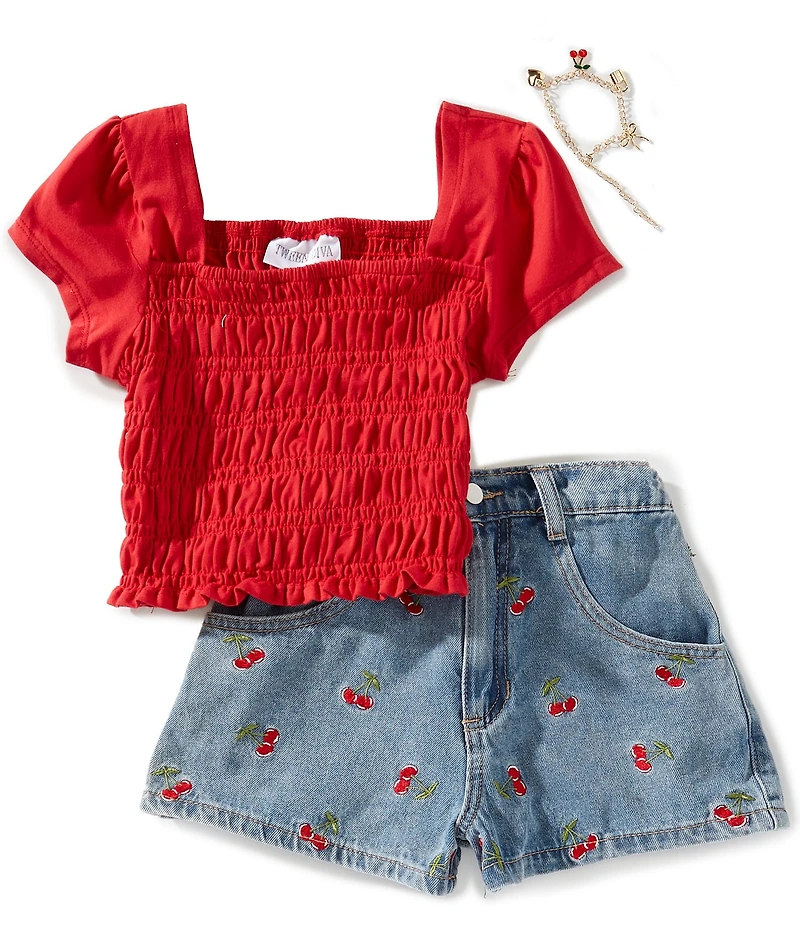 Rarity Big Girls Cap-Sleeve Smocked Top & Cherry-Embroidered Denim Shorts Set in Chattanooga, TN