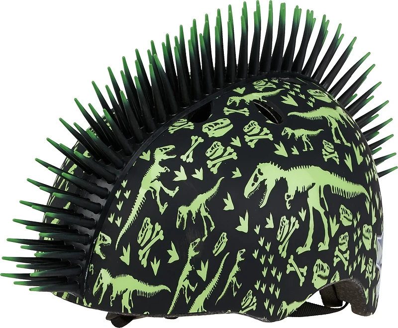 Make a ferocious statement with the Raskullz T-Rex Bonez Mohawk Toddler Bike Helmet. This dinosaur-inspired bike helmet has bright green dinosaur skeleton images printed over the entire helmet. It also features an eye-catching 2-inch tall bendable black 3D mohawk with bright green tips. Perfect for tearing it up like a dinosaur on a bike, scooter, or skateboard. Recommended for ages 3 - 5 years old with heads measuring 48-52 centimeters.