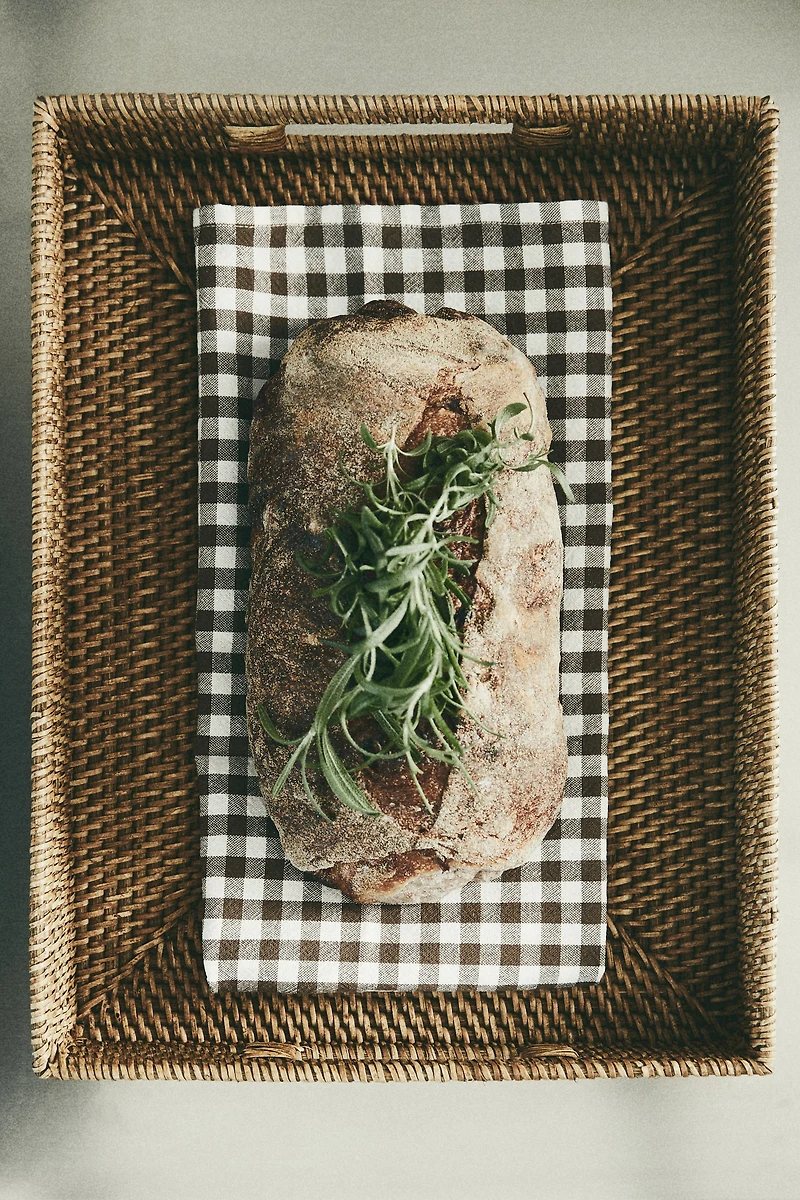 Handmade rattan tray with handles at short sides. Avoid contact with water. Width 12 1/2 in. Height 2 1/2 in. Depth 16 1/2 in.